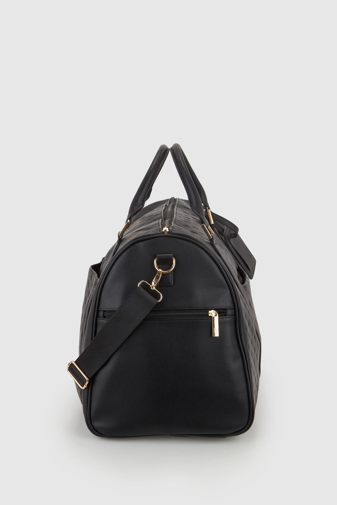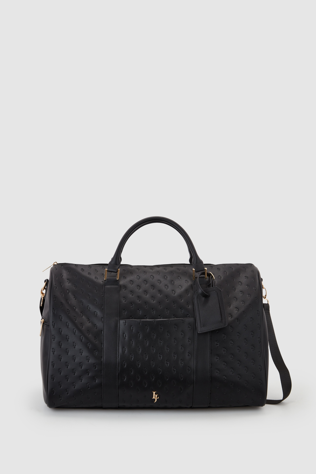 The embossed duffle weekender bag complements the handbag range with its spacious main compartment, luggage tag, convenient trolley slide, and a removable adjustable shoulder strap.